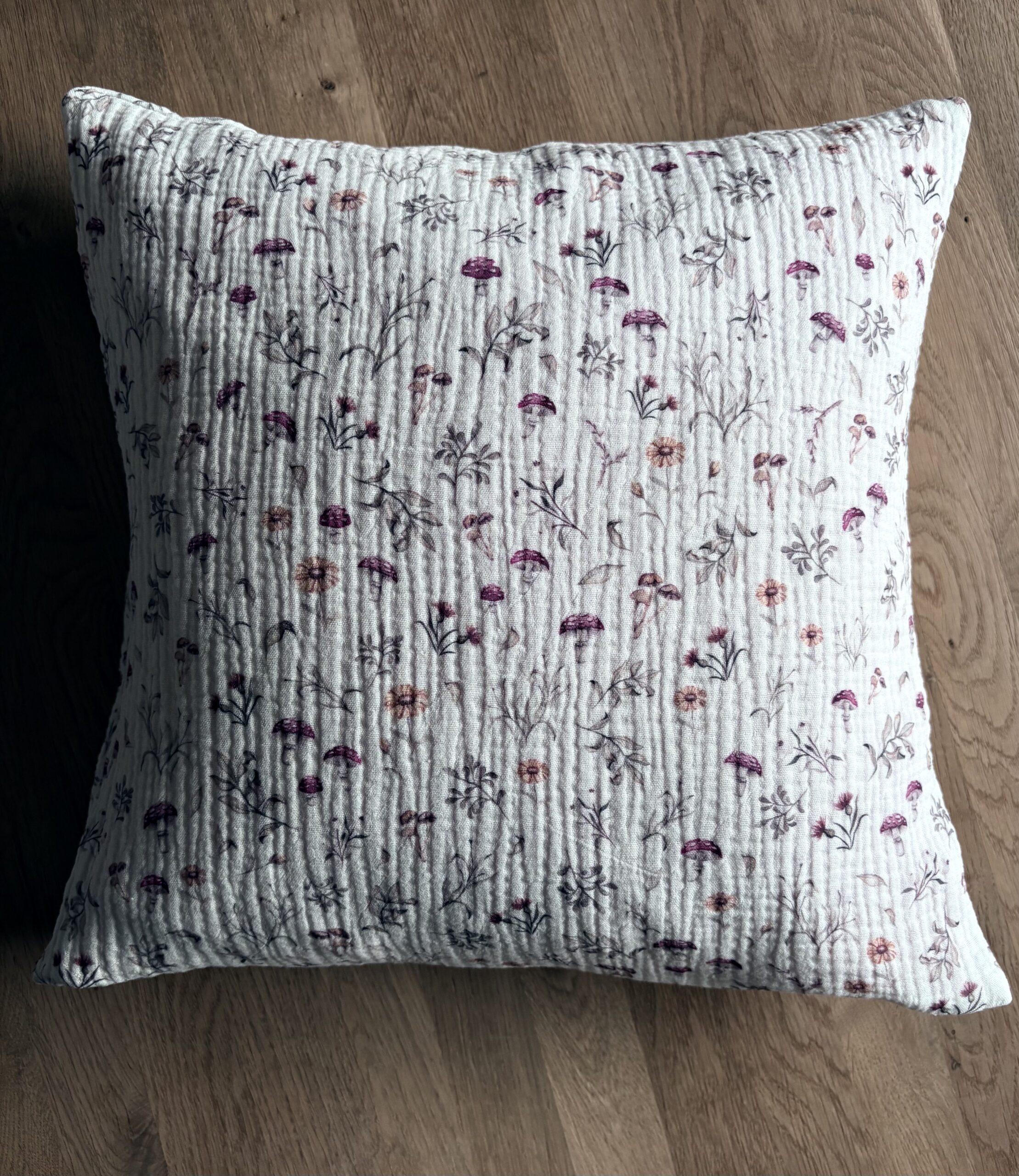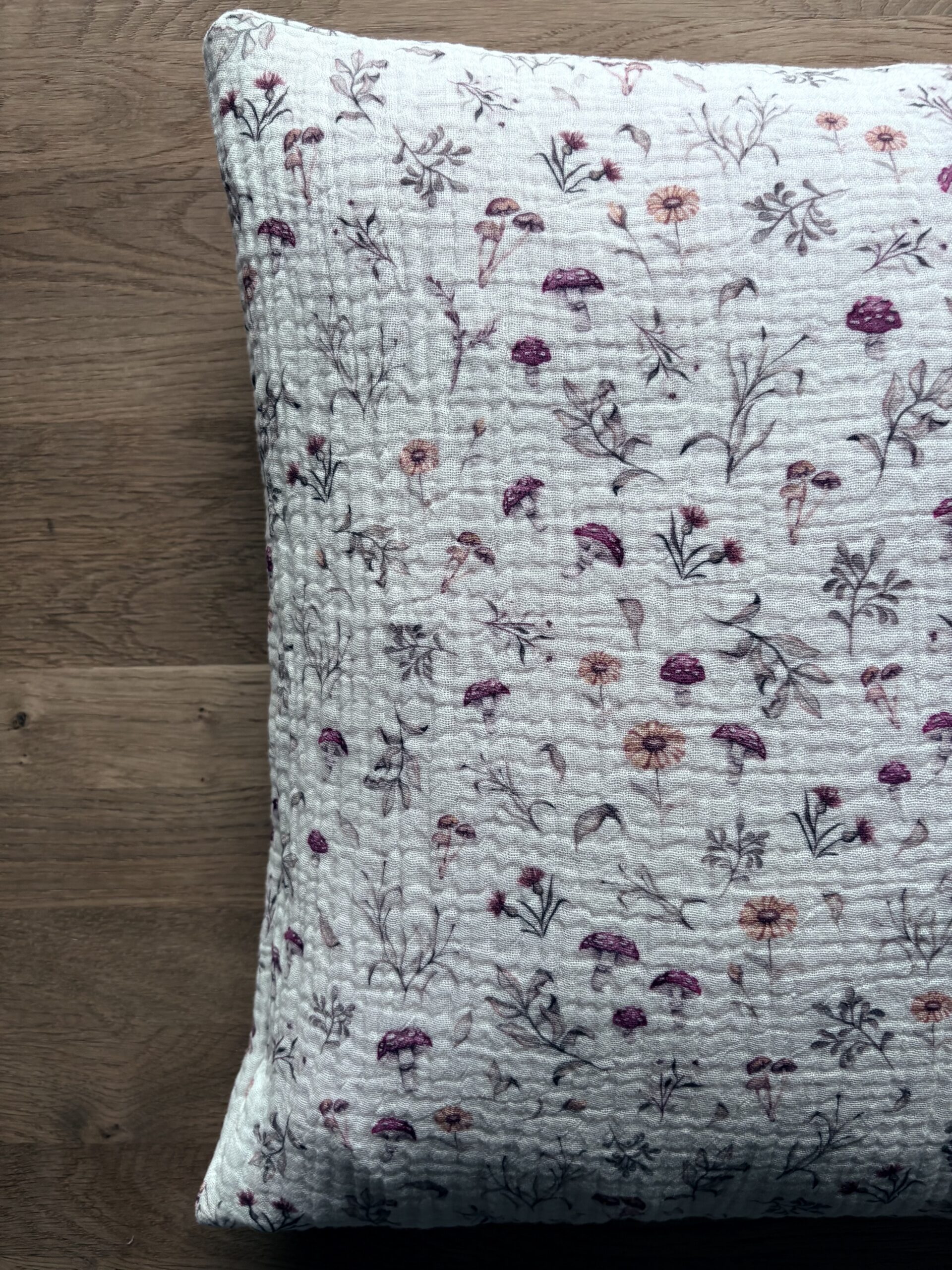 Poszewka muślinowa – runo leśne to doskonały wybór dla miłośników stylu boho, eko, skandynawskiego czy rustykalnego. Jasny, kremowy kolor świetnie komponuje się z naturalnym drewnem i pastelami, wprowadzając do wnętrza przytulność i świeżość. Uroczy wzór grzybków i kwiatów doda uroku każdemu wnętrzu.