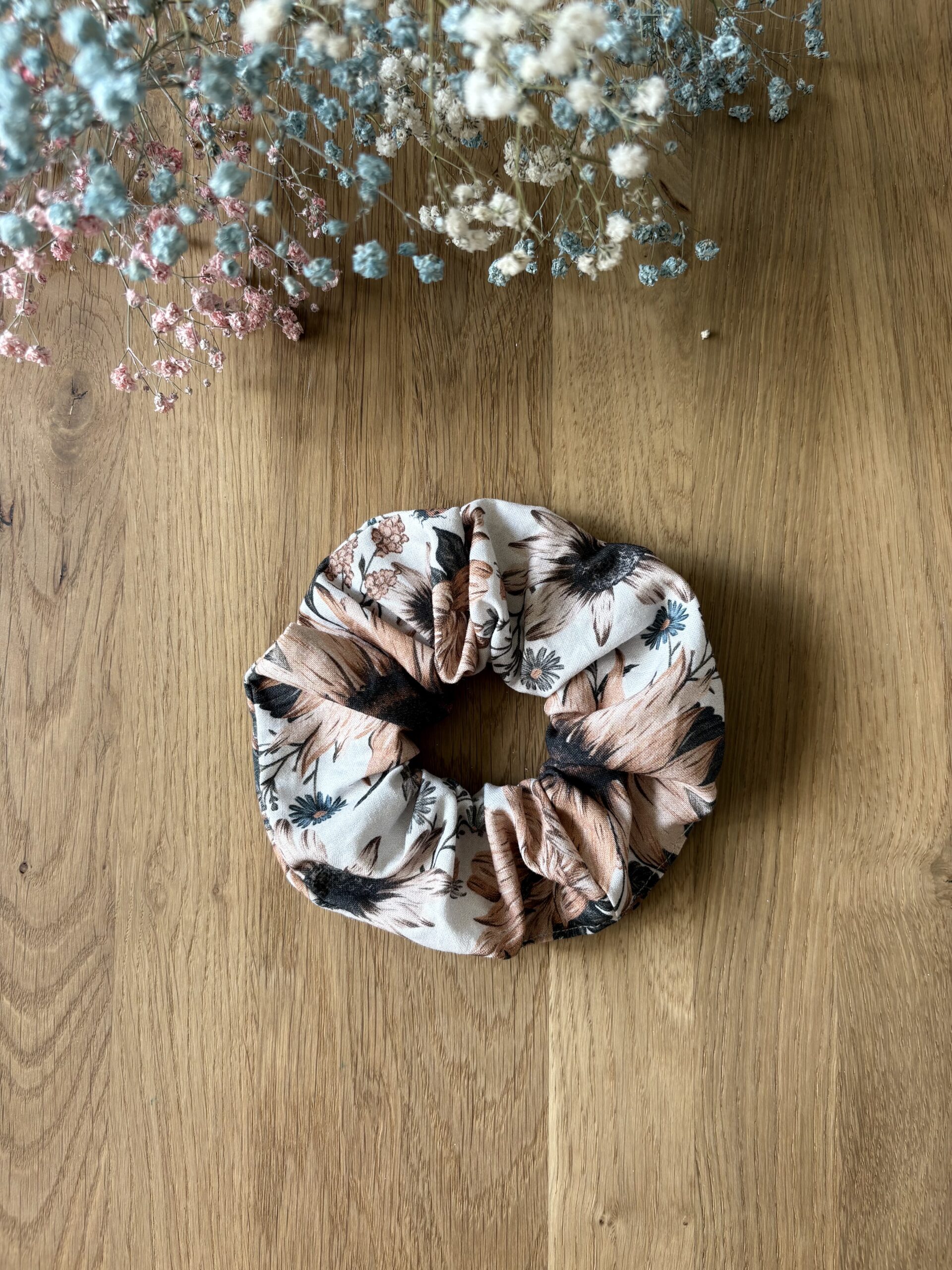 Scrunchie bawełniana – retro słoneczniki – delikatna gumka do włosów z naturalnej tkaniny
