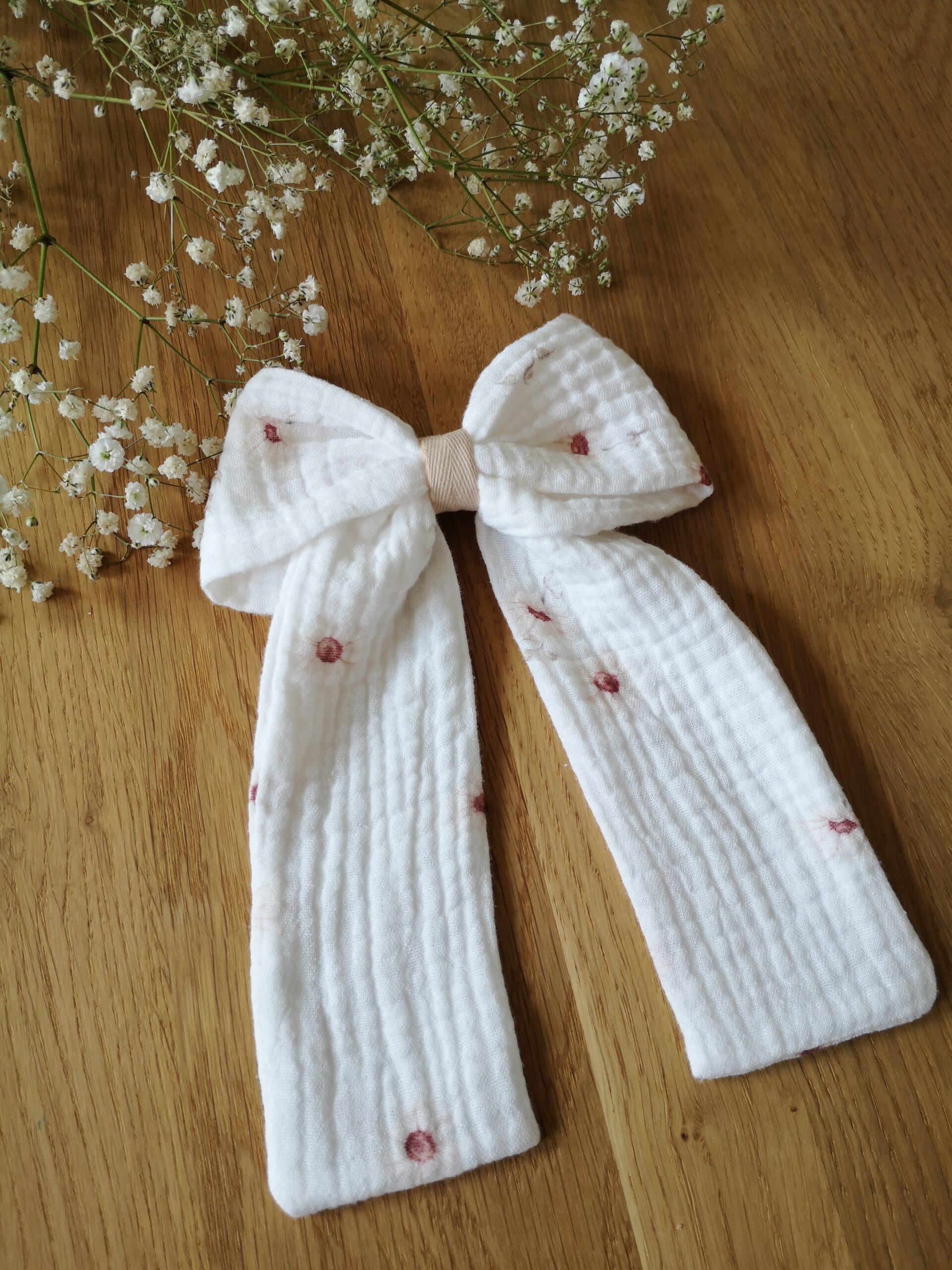 Nasza muślinowa spinka do włosów z kokardą to świetny dodatek dla miłośniczek stylów takich jak village, vintage, slow fashion oraz rustykalnego. Świetnie wygląda w spiętych włosach, w półupięciach, a także jako ozdoba do fryzur dziecięcych.